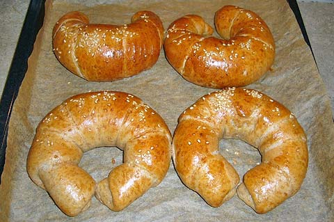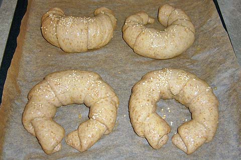 周老師美食教室有一篇金牛角麵包, 圖解說明的很詳細, "看似不難", 也想試試看, 但難在P某悟性不高, 手不巧, 結果~~香是香, 但外表還真不像, 不但牛角不尖, 烤後連捲起來的紋路都不見啦!